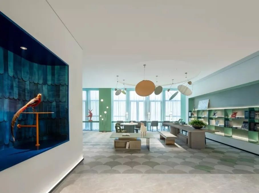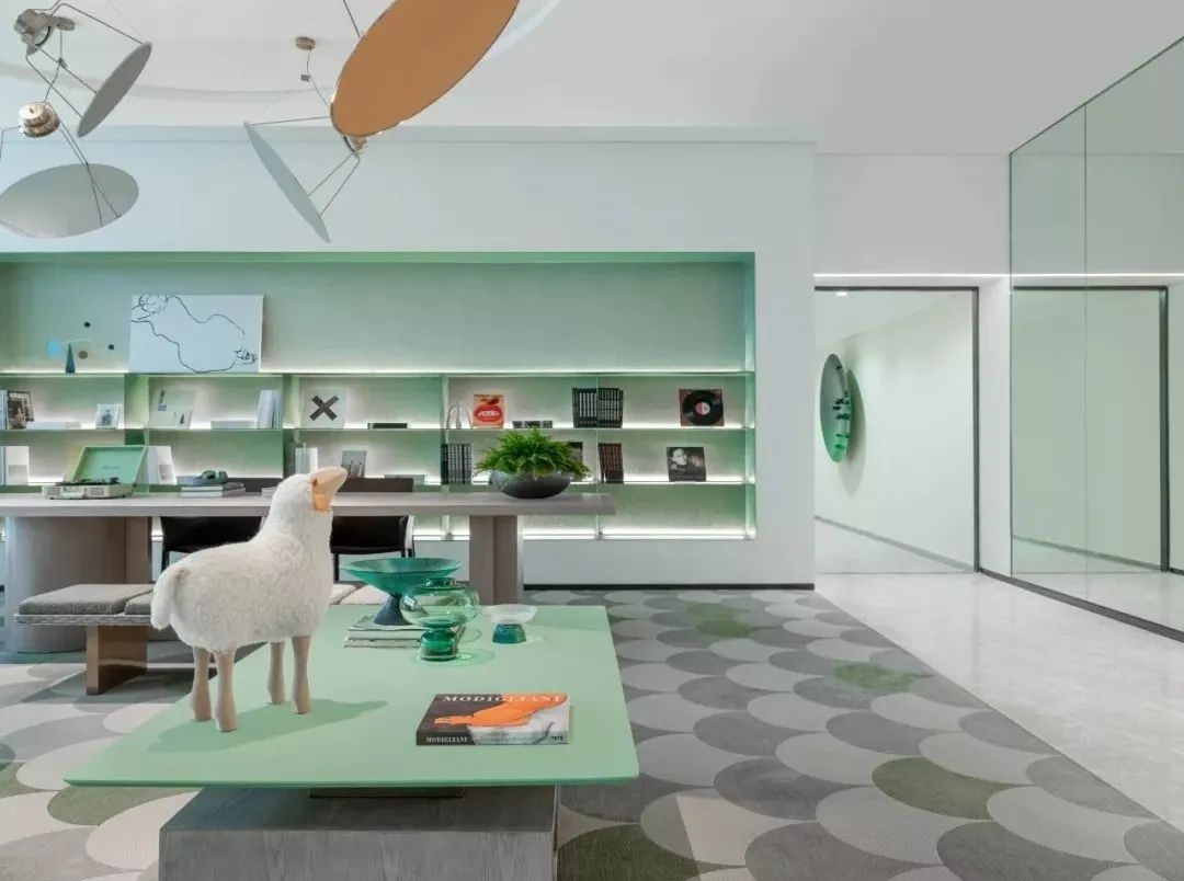 WIPESTAIN艺术涂料蕴涵着万物萌发的无限生机。不同明度和色阶的青色如水彩般濡湿、浸透、调和于空间体块中,由外及里构成天成地接的阶梯式递进氛围。动线中视觉落点的装置器物,则以抽象重叠的褶皱与纹理勾勒细部精微之美,镜面的穿插运用亦带来视错观照的多重意趣。