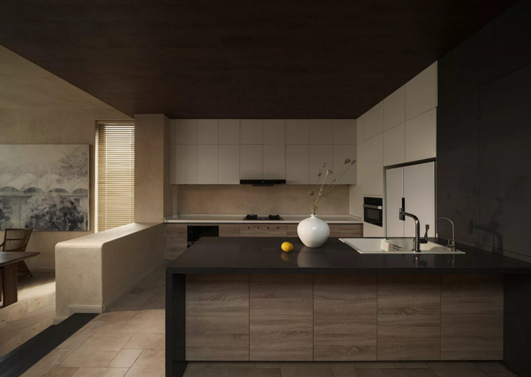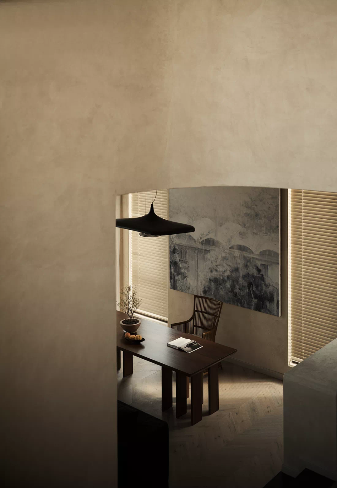 进屋即踏入WIPESTAIN艺术涂料包裹的独立精神领域,中和色系高级纯色系列,化解非黑即白各持一面的偏向,阐述居者对悦己生活的笃定抉择,赋予场域气韵及厚重空间。