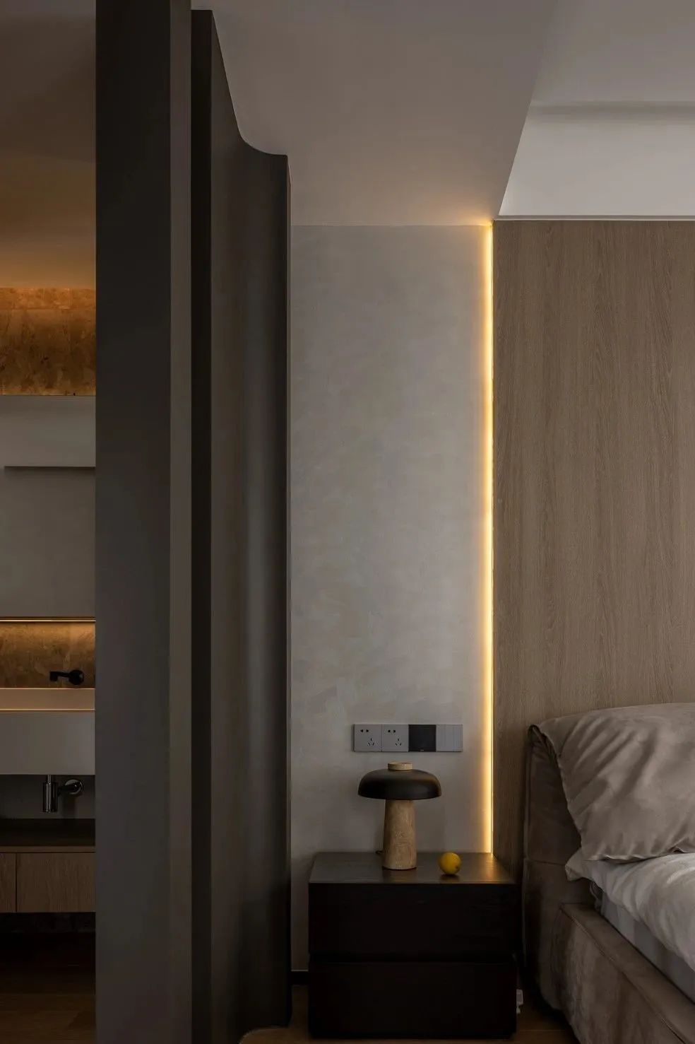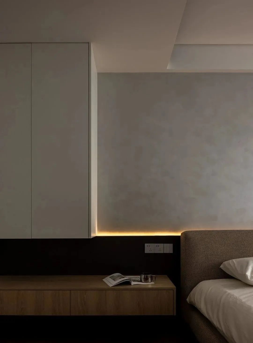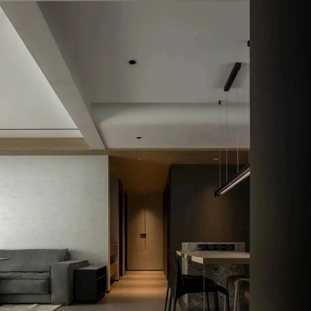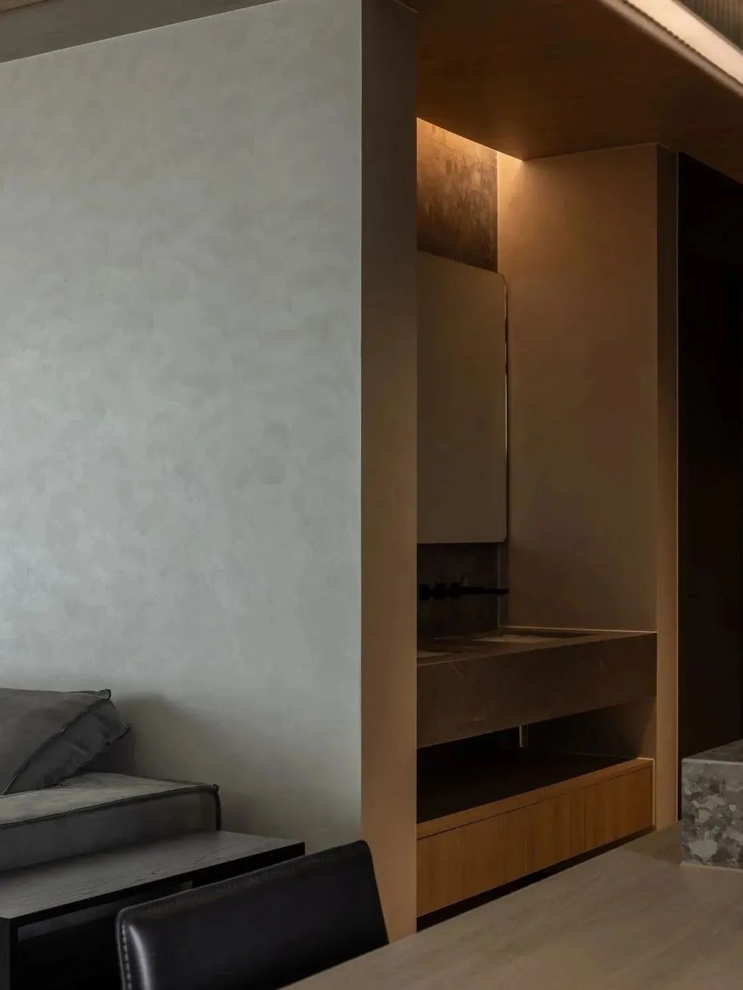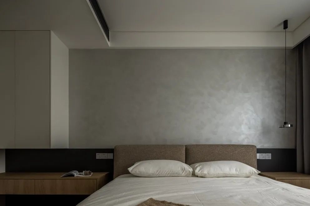 空间经过WIPESTAIN艺术涂料墙面材质呈现出不一样的广阔,独特质感的艺术漆模糊了墙顶边界,冷静包容的空间气质让思绪得以在这里自由驰骋。