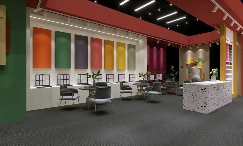 威普斯丹(Wipe stain)本次的展厅设计基本是以上述六大产品系列为主,通过展板上六款不同材料、不同色彩、不同工艺的产品表现,让参观者直观的感受到艺术涂料的层次与肌理,碰撞出不同的视觉享受。整个展厅,色彩丰富却又不失素雅,色调时尚舒适,引领着未来的艺术涂料市场风格。