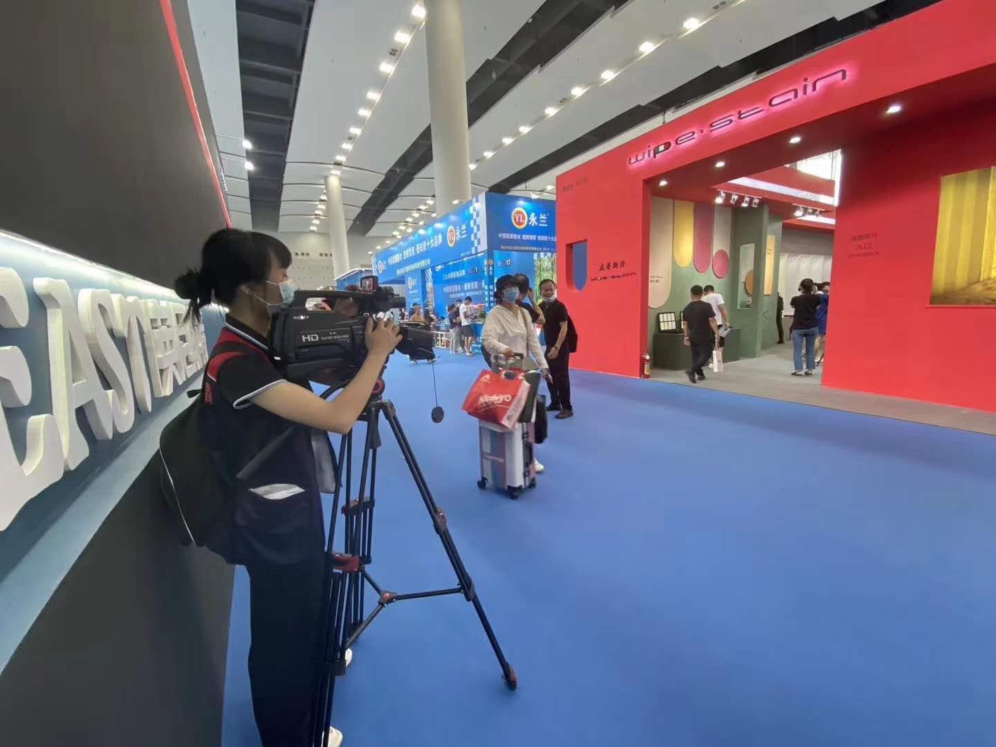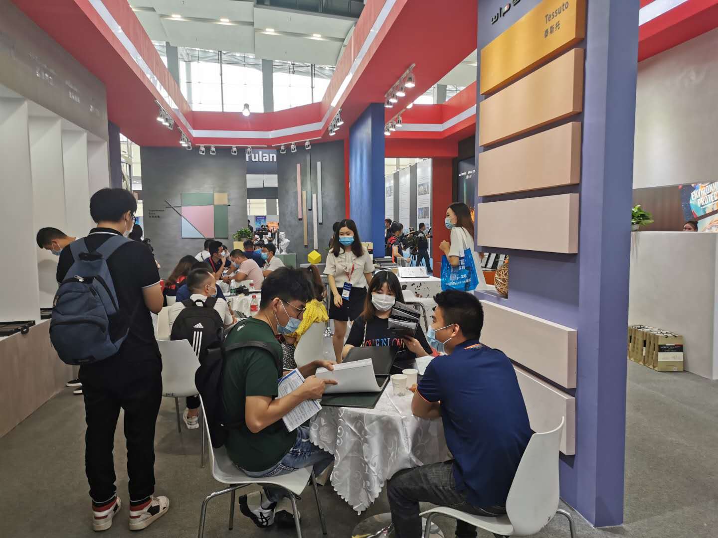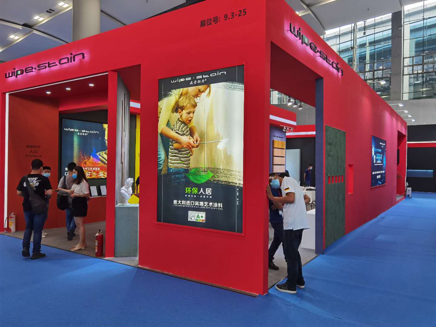 展馆外墙用的这个涂料正是本次展会主推的产品系列之一(Superbianco Extra 苏伯利亚)。红色的蛋壳光色彩冲击,寓意艺术涂料市场的红红过火,正如开展首日,威普斯丹(Wipe stain)就喜迎“开门红”一样。
