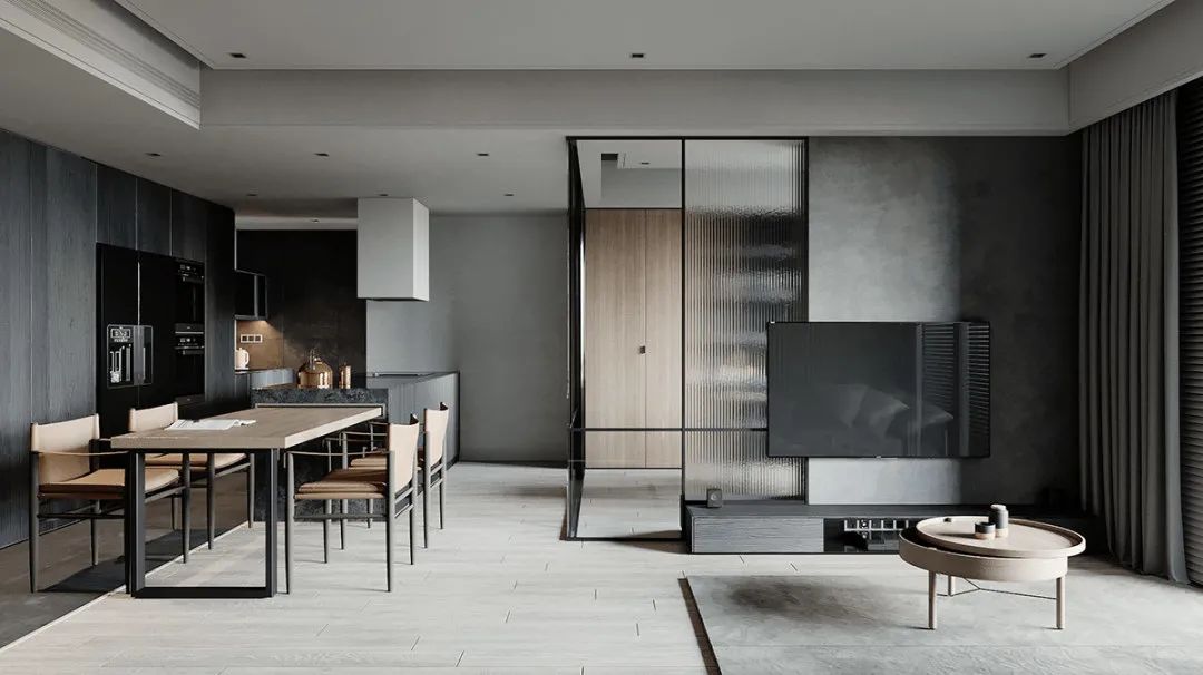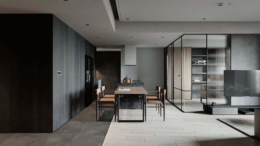在墙面的设计采用稍重的灰色调,把整体氛围压住,不至于显得很飘,同时再用中间色调的灰色加以调和,稳住整个风格设计。