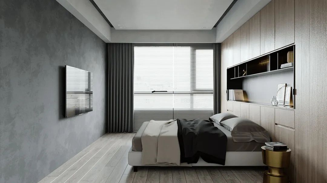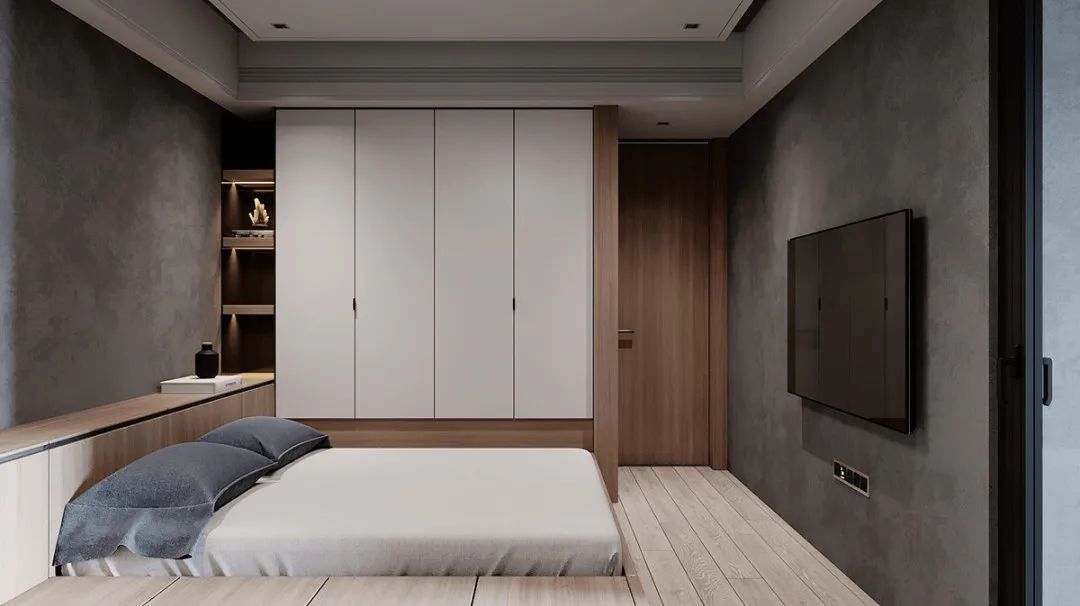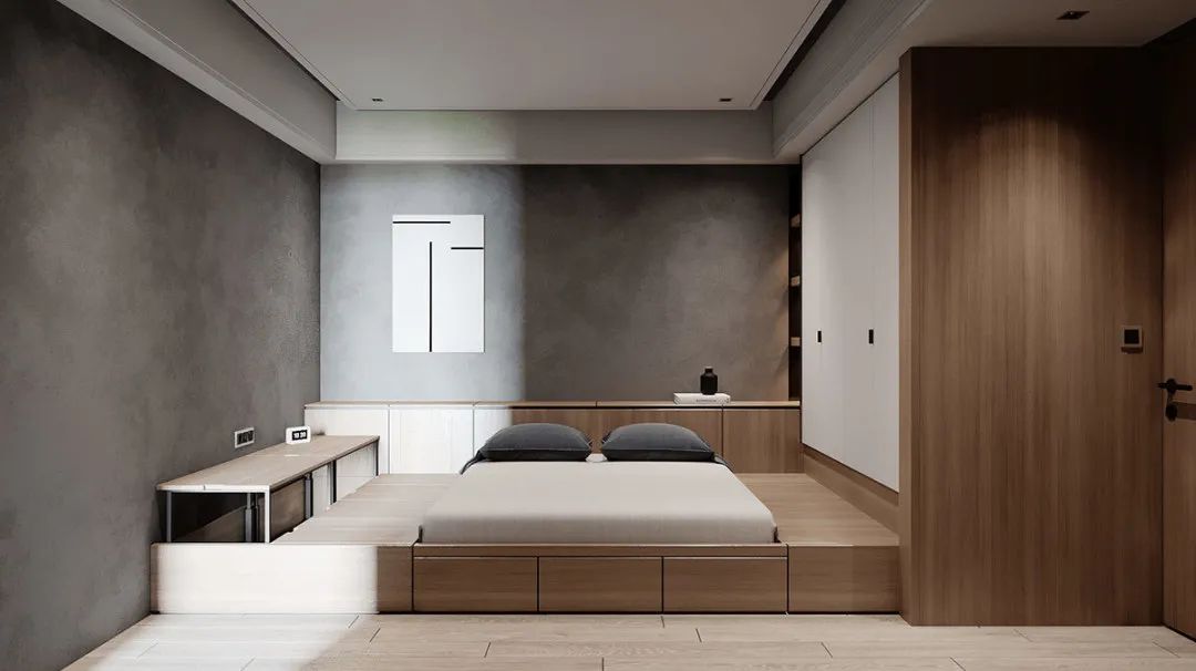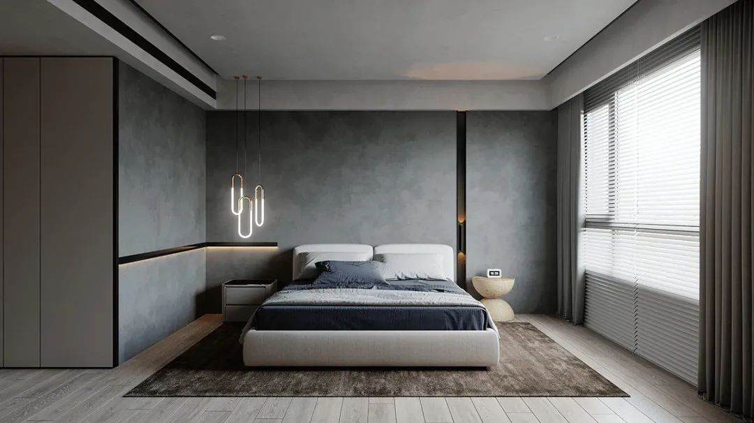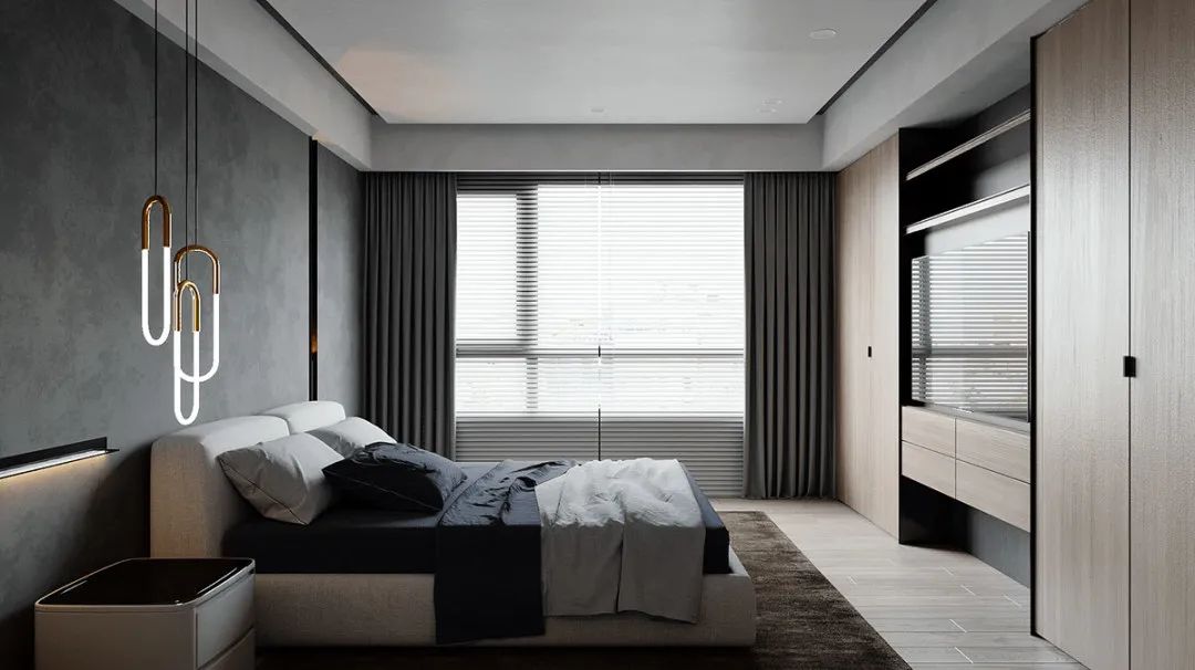 卧室的陈设,在黑白灰间穿梭,光影层叠的交替,还原了材料本身的质感。色调的层层推进,让空间更有层次感色。