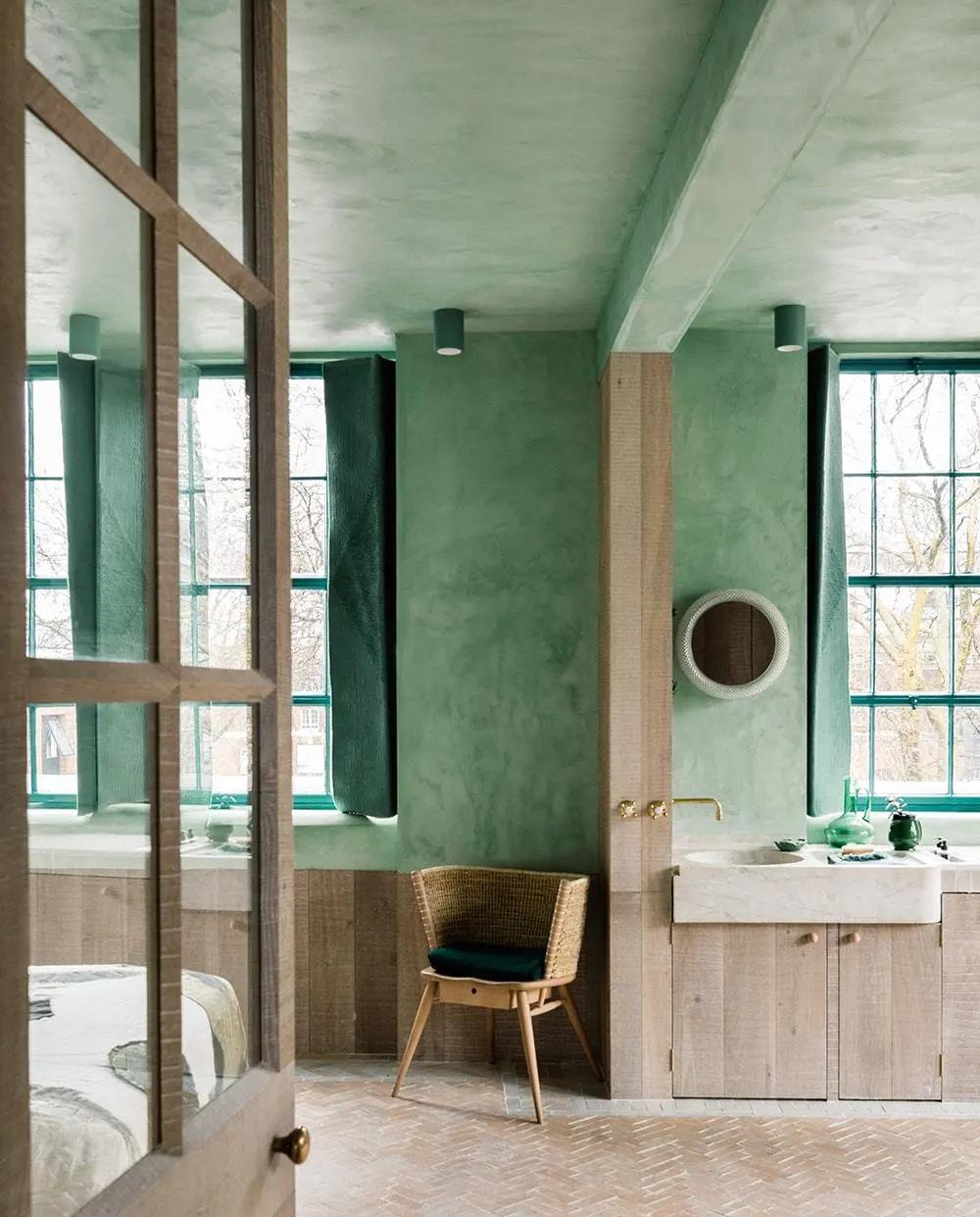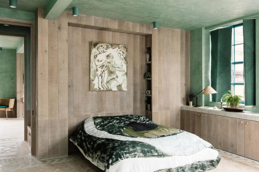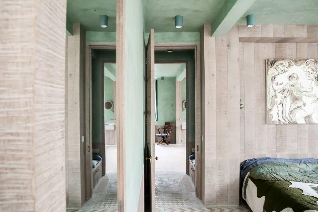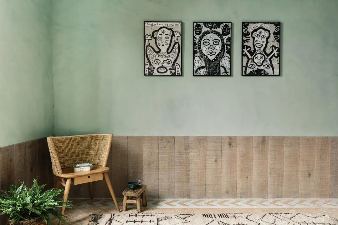 The Barcelona couple defined their home as an open oasis. With the combination of verdant tones and natural textures, the lime plaster walls, linen shutters, lime oak wood brushing and other details complement each other. WIPESTAIN original imported art paints bring this home A unique romance.