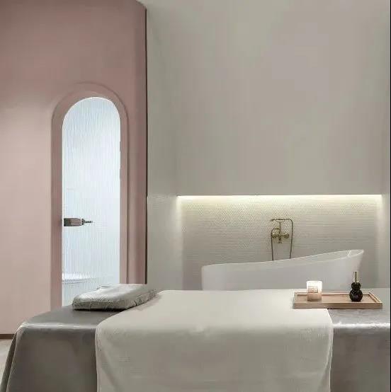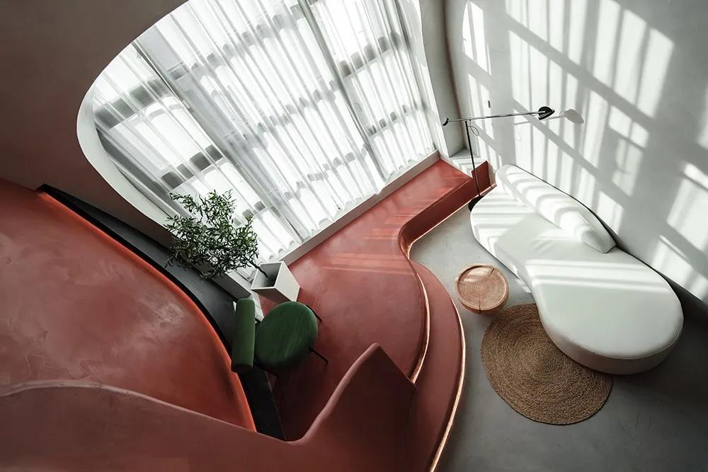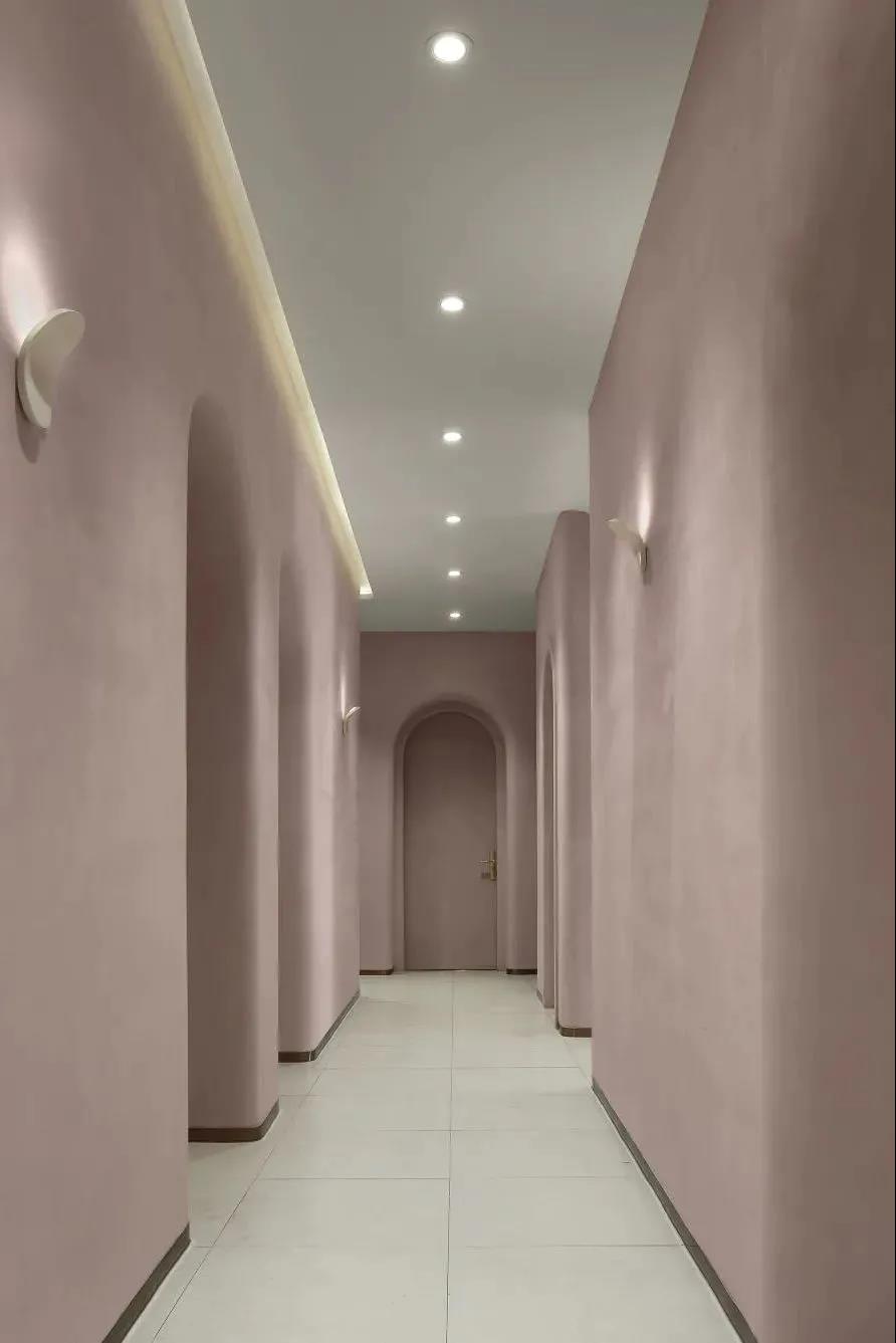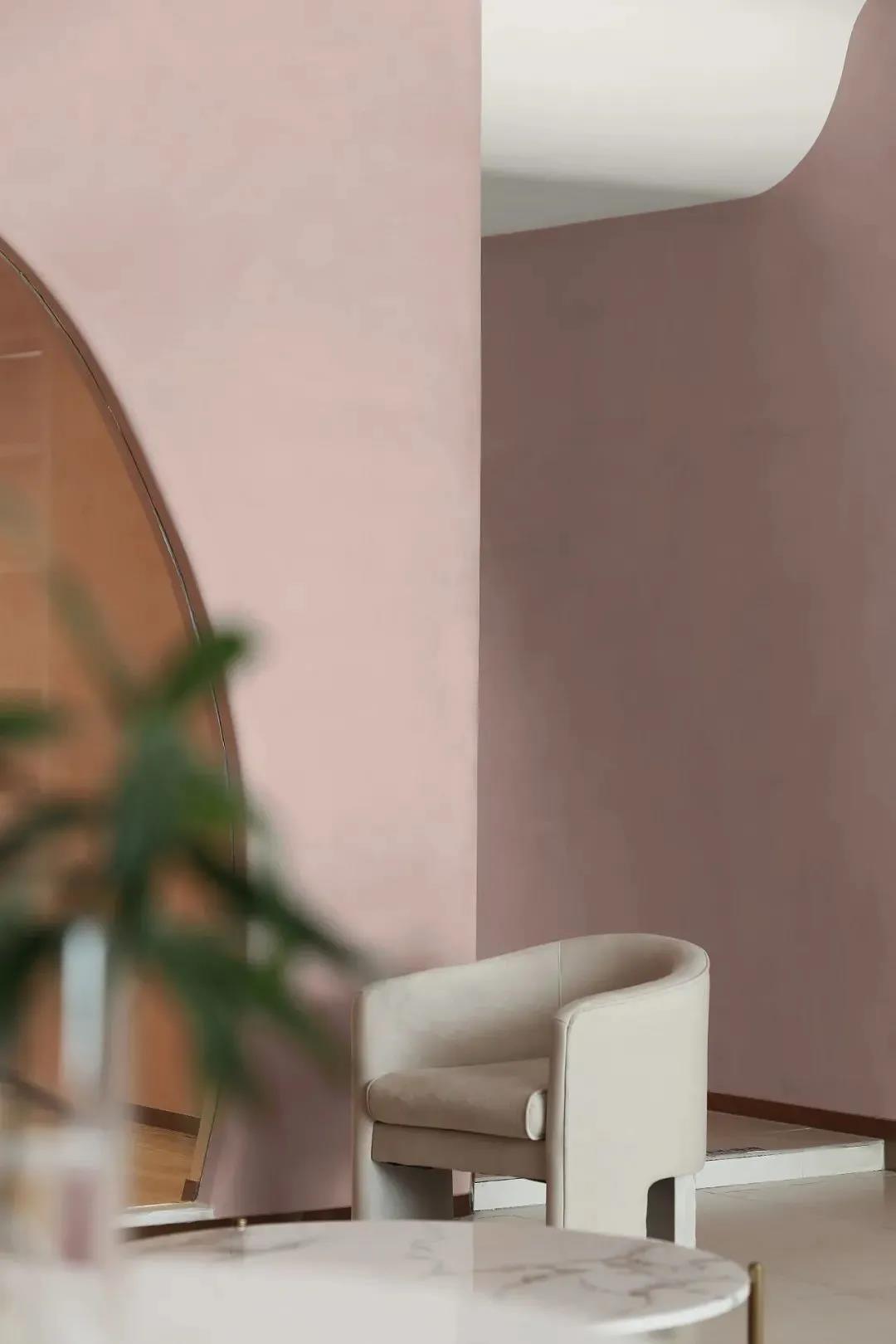 以粉色系WIPESTAIN艺术涂料作为主基调来衬托空间的温柔,卷曲的形体连接了不同的空间,空间和墙面本身的材质语言非常简单,尽可能用一种语言一句话概括了所有想表达的外在和内在。